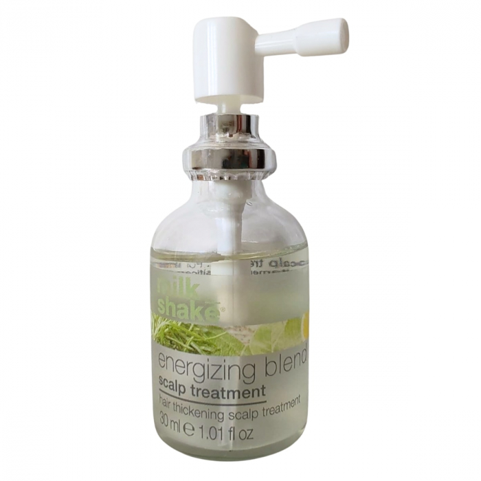 Milk Shake Scalp Care Energizing Blend este un tratament intensiv pentru scalp (30 ml), creat pentru a revitaliza părul subțiat și fragil. Formula cu extracte organice de rozmarin (efect tonic și purifiant), salvie (calmant și deodorant), balsam Fioravanti și camfor stimulează microcirculația scalpului, creând un mediu optim pentru creșterea părului. Proteinele de orez hidrolizate și panthenolul („pro-vitamina B5”) adaugă densitate și condiționează firul de păr, în timp ce uleiurile esențiale (eucalipt, mentol) oferă o senzație răcoritoare și revigorantă după aplicare.